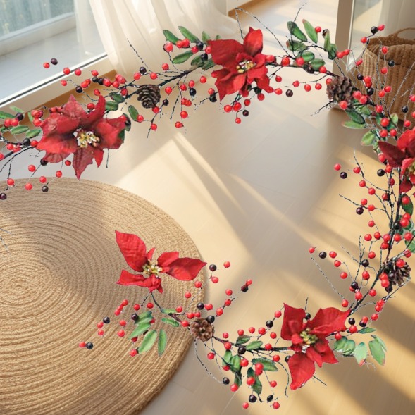 Poinsettia and red berry garland for Christmas decoration. Length 200 cm. The length is customizable.