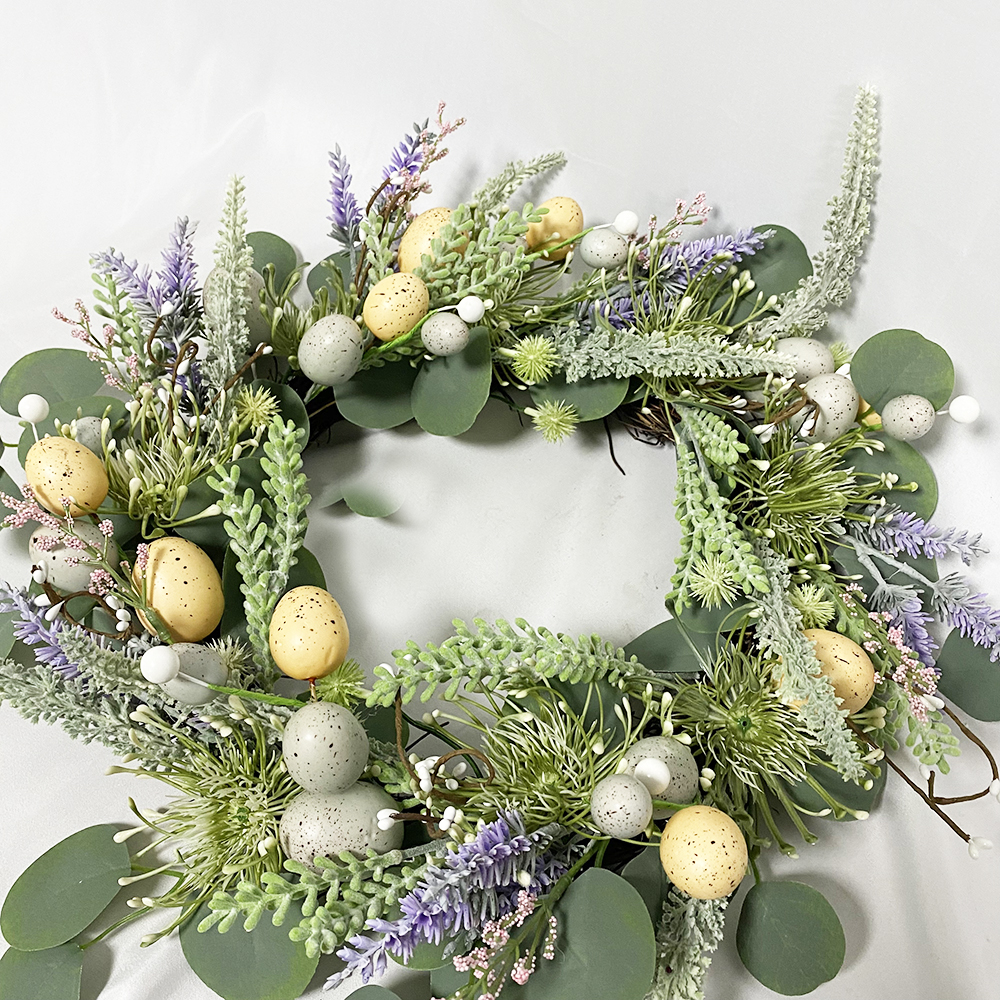 From this base emerge delicate sprigs of light green artificial foliage, interspersed with slender stems of soft purple lavender and fine, grassy fronds, lending a fresh springtime air. The wreath is playfully adorned with speckled Easter eggs in two styles: plump yellow eggs and smaller grey-white eggs, both dotted with dark spots. These eggs are nestled randomly among the foliage, creating a sense of joyful discovery.