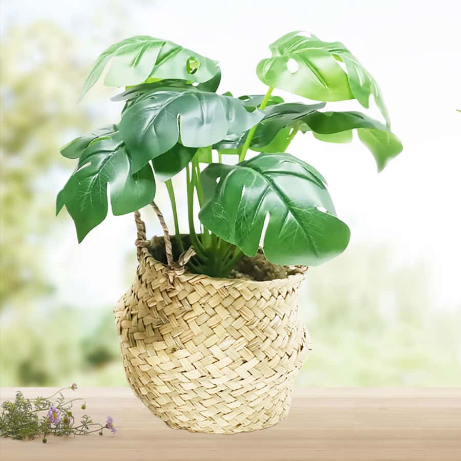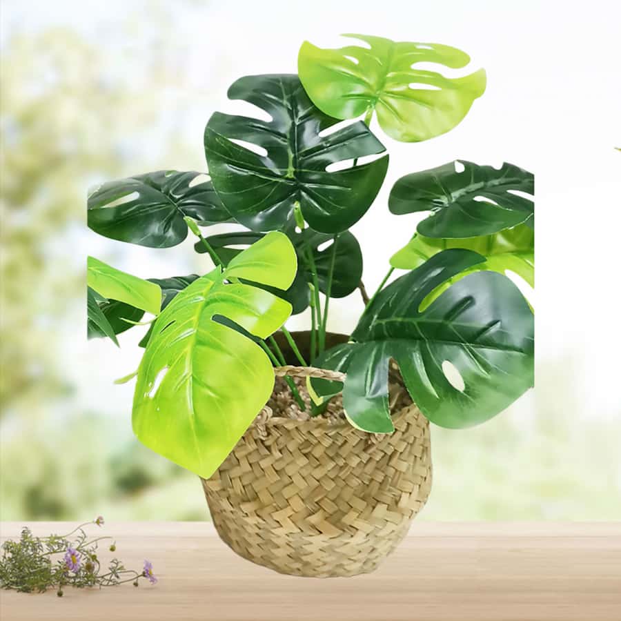 This artificial table green plant made of eucalyptus or monstera with natural esagrass basket.