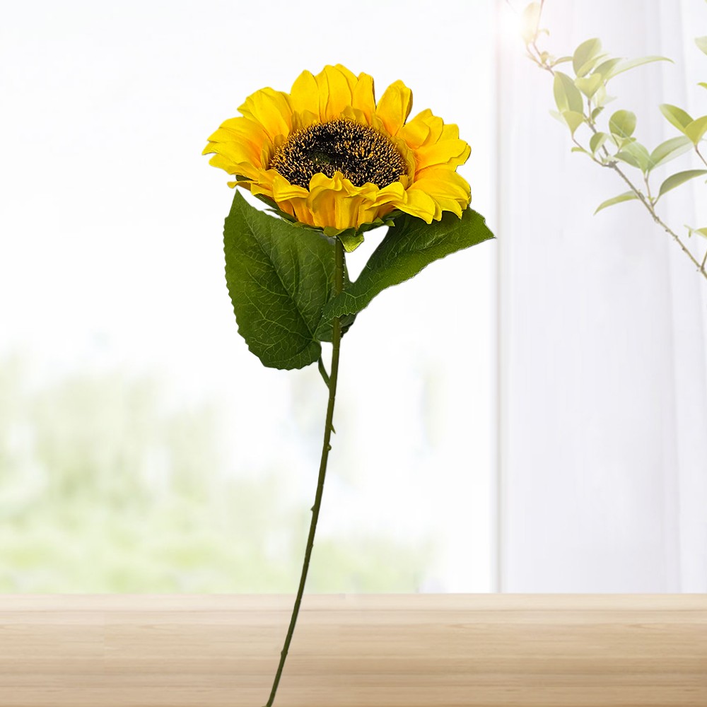 Bring the warmth of a summer’s day into your home, any day of the year. Our lifelike artificial sunflower stem is crafted with meticulous attention to detail—from its vibrant yellow petals and textured dark center to its sturdy green stem and realistic leaves. Made with high-quality silk and durable materials, this sunflower never wilts, needs no water, and stays perfectly bright in any light.